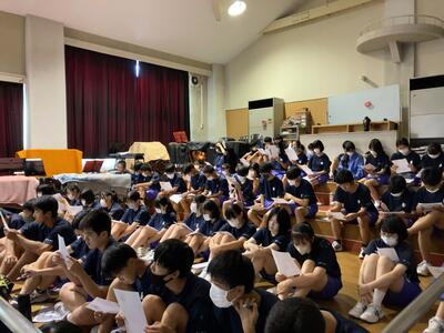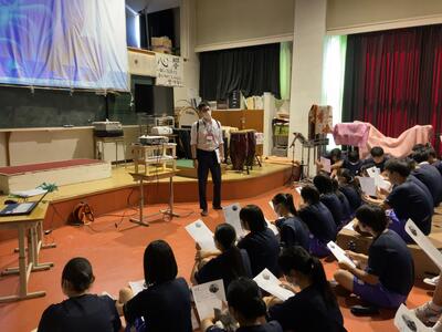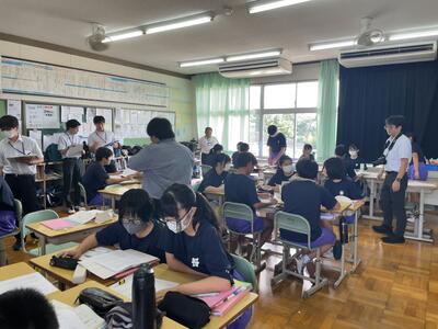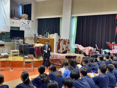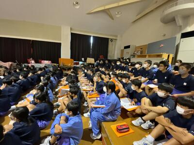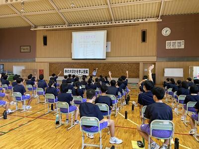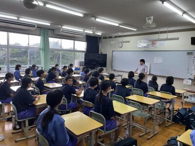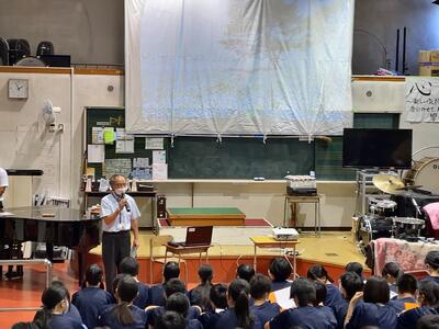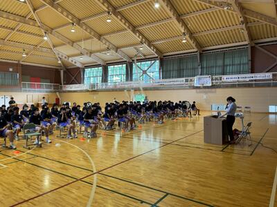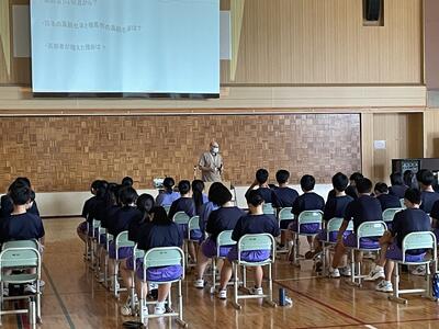 来週27・28日に福祉体験活動を行う3年生を対象に、社会福祉協議会の方より、高齢者福祉に関しての講話をいただきました。来週は、高齢者疑似体験など2日間にわたって福祉について学習する予定です。来週は全学年体験学習となっております。2年生は職場体験、1年生は防災に関する学習を行います。