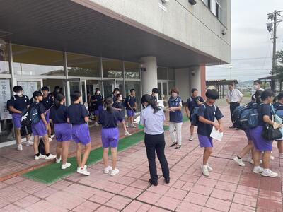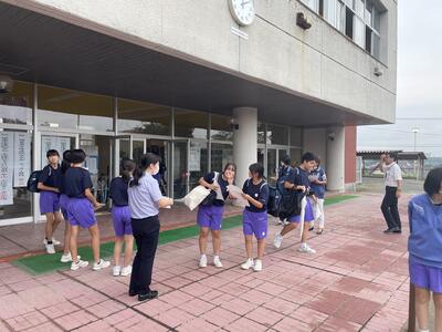 昇降口前にて、少年非行防止広報活動が行われ、闇バイトや自転車盗難等の非行の未然防止と犯罪被害防止を目的として、相馬警察署員と生徒会役員がチラシを配付しながら活動を行いました。