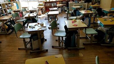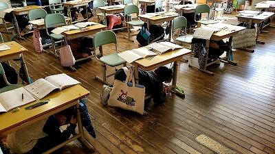 教室の中では机の下に、隠れる場所がなければ外側から離れた場所で直ちにダンゴムシのポーズ。ガラスも気をつけなければなりません。