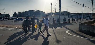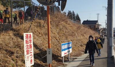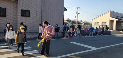 メンバーと協力しながら、安全に気をつけて歩いて登校する子ども達の様子です。