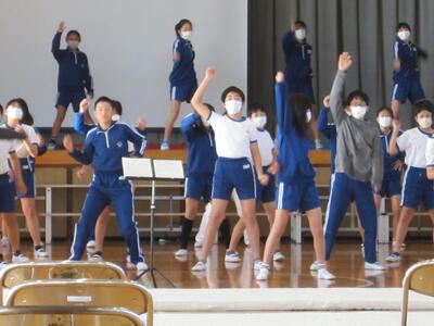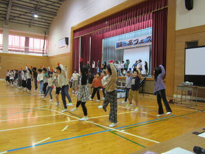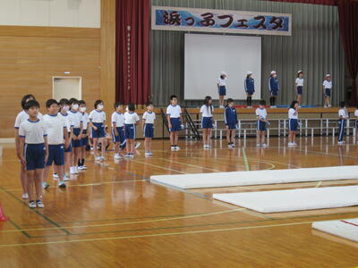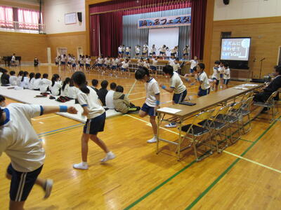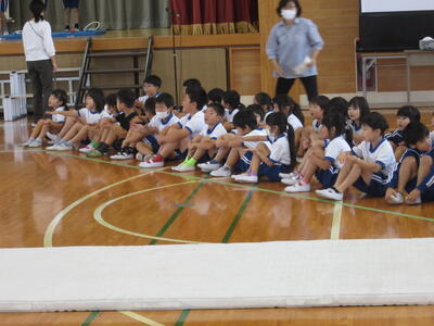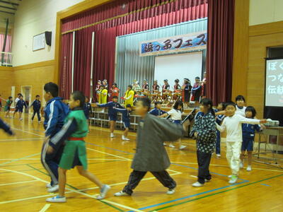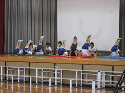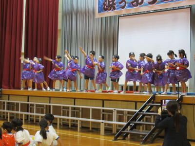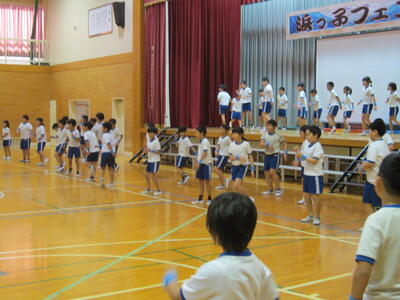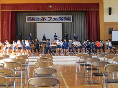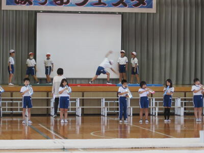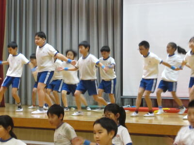 4年生は音楽に合わせてマット運動や縄跳びの技の披露です。また、プロのダンサーの方に教えたもらったダンスも練習を重ね、本番では精一杯踊りました。