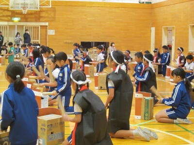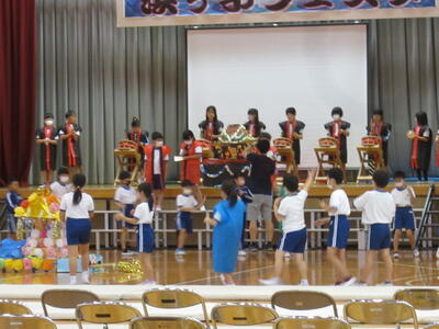 3年生は、総合の時間に調べたことを発表しました。上級生が活動している「原釜太鼓」から問題を出しました。1,2年生は答えを聞くたびに一喜一憂していました。劇をやったりおみこしをかついだり、バリエーション豊かな発表でした。
