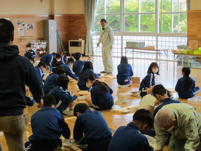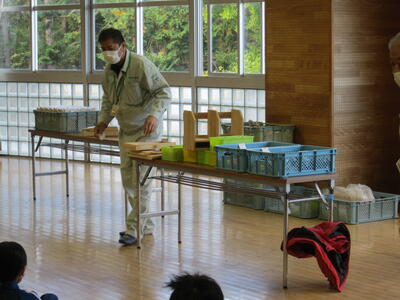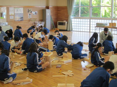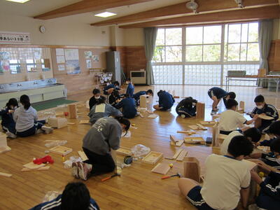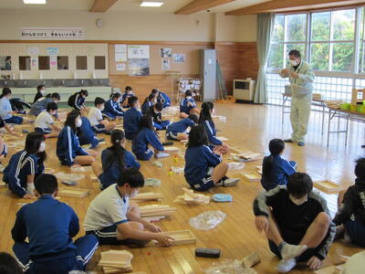 6年生が森林環境学習として、木製のブックスタンドを製作しました。木材を組み合わせ、ボンドや釘で接着していきます。相馬地方森林組合の方のご指導で、短い時間の中で完成させることができました。