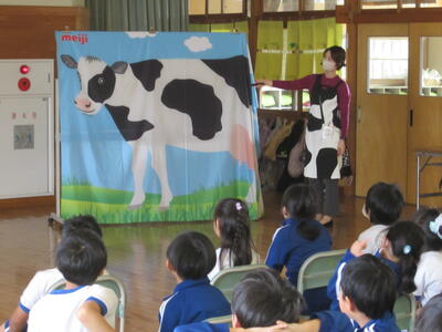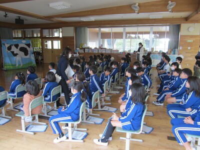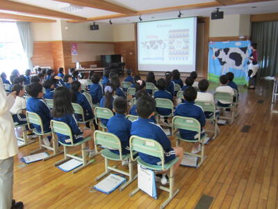 株式会社明治の方においでいただき、2年生がみるく教室を行いました。普段給食で飲んでいる牛乳について、またそれを作っている乳牛について勉強をしました。学校の近くでは乳牛を見る機会は少ないのですが、今回の授業で牛乳に関わる様々な事を知ることができました。