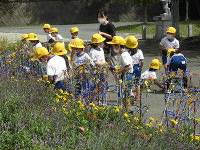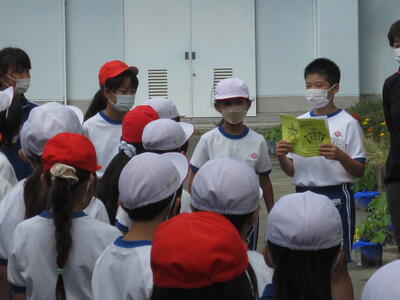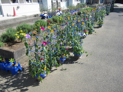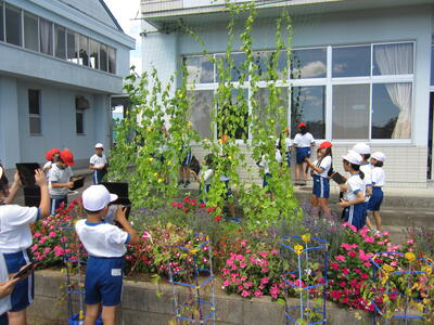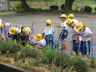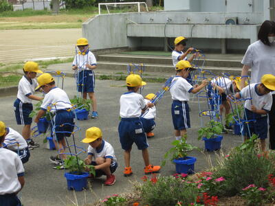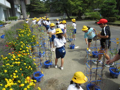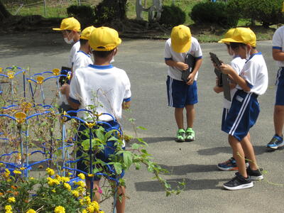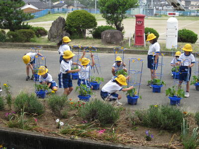 1年生はアサガオ、2年生はミニトマト、3年生はホウセンカを育ててきましたが、あっというまに花が咲き、実がなっています。