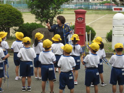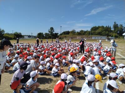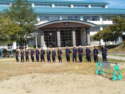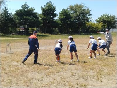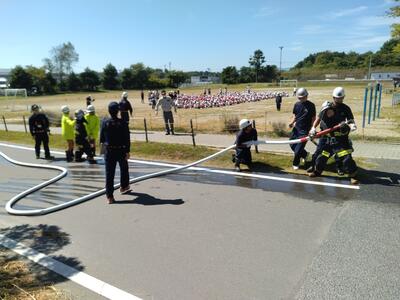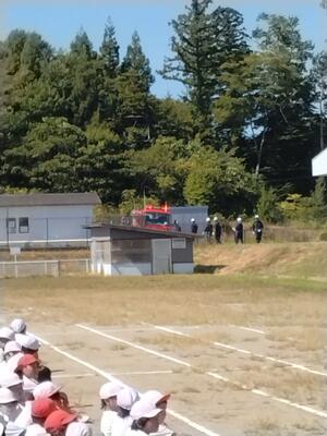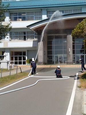 本日は、火災を想定した避難訓練を行いました。今回は校庭への避難だけでなく、地元消防団による放水訓練、消防署の方の協力での水消火器による放水訓練も行いました。子どもたちは、プールの防火用水を、校舎へ向けて放水される様子を見て「すごい」「かっこいい」と声を上げていました。