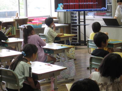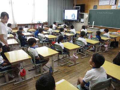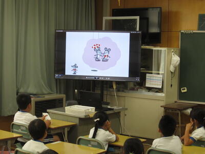 1年生の人権教室は、「思いやり」に関する内容でした。DVDを見て、登場人物のネズミ君とネコ君の関係を通して相手のことを考えました。