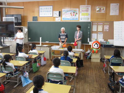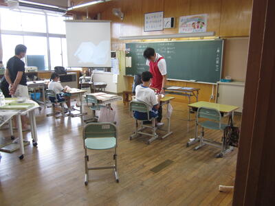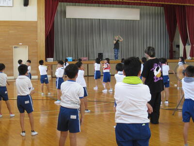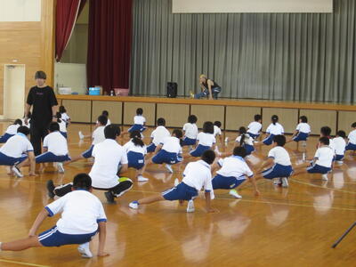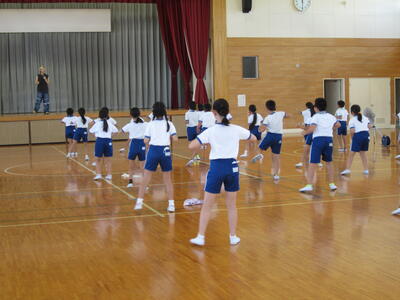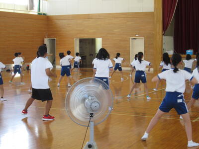 東北ダンスキャンプから3名の方においでいただき、4年生を対象にダンスを行いました。体育館の戸を開けていると、時折涼しい風が吹き込みます。また、扇風機をたくさん稼働させ、休憩や水分をこまめにとるなど、熱中症には十分注意しました。