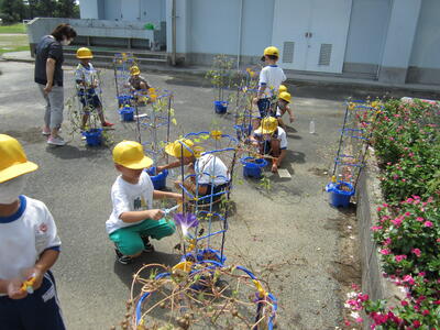 1年生がまいたアサガオの種が、芽を出し、ぐんぐん成長してきました。梅雨の雨と、時々出る日差しを浴びて、植木鉢からはみ出るくらいです。そこで、成長の手助けとなるように、支柱を立てました。