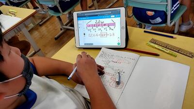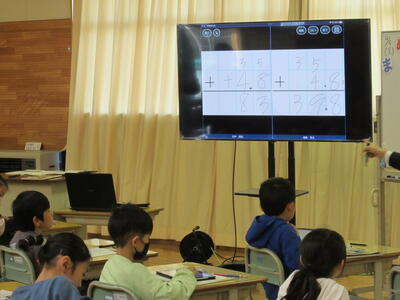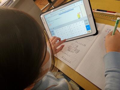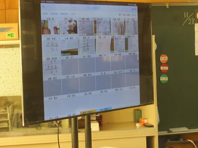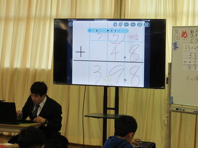 12月には「未来の教室」の研究公開があります。3年2組では、算数「小数」の研究授業を行いました。整数と小数のたし算のひっ算の仕方を考えます。ロイロノートを使って、子どもたちの考えを提出させたり、適応問題に取り組ませたりします。子どもたちのタブレットの操作は慣れたもので、やり方を教えなくても自分で指示されたことができていました。