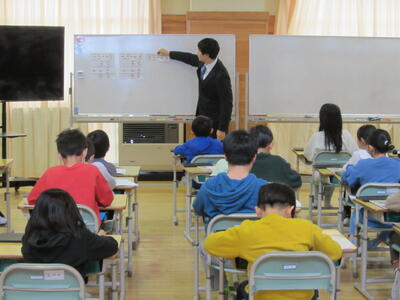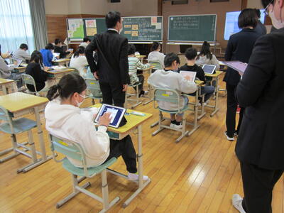 相馬地区から多くの先生方の参加をいただき、授業公開を行いました。6年生は、デジタル教科書、ロイロノートを使っての授業です。教科書を読み取りながら、日清、日露戦争のきっかけや結果をまとめていました。6年生も授業後半には、問題作り、お互いに解き合っていました。