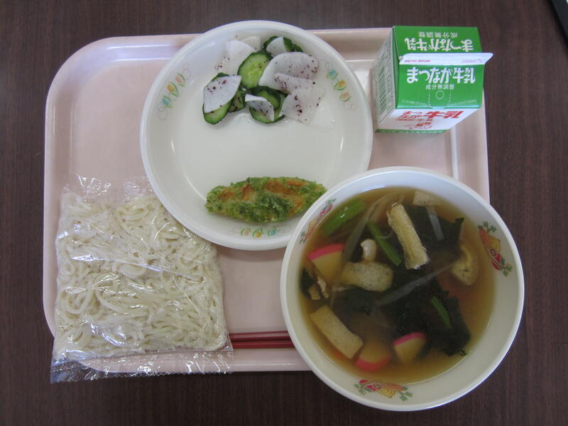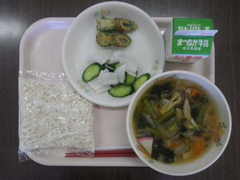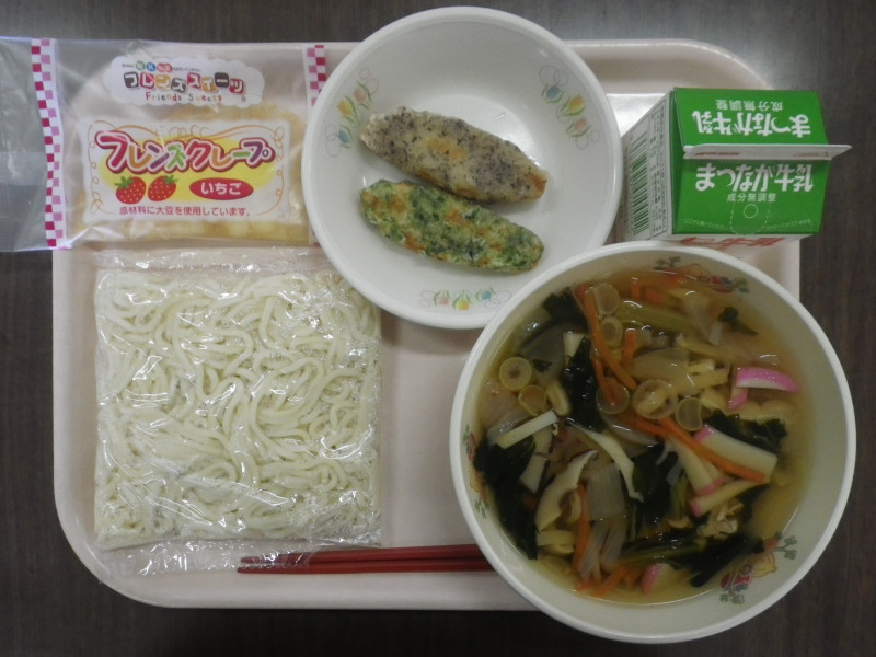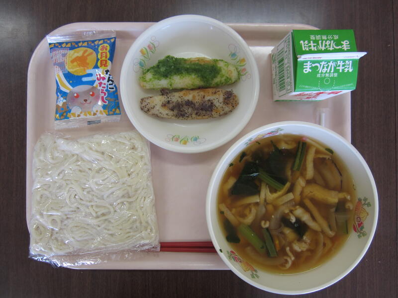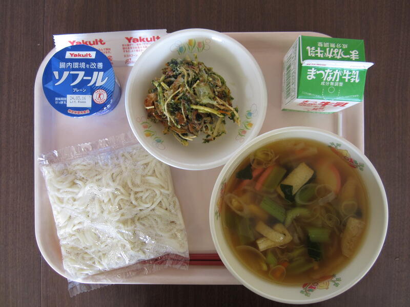 4/13 肉うどん 牛乳 ささかまのいそべあげ ゆかりづけ