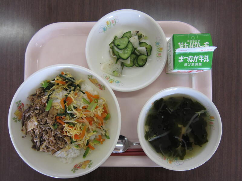 4/17 ビビンバ丼 牛乳 きゅうりの梅あえ わかめスープ