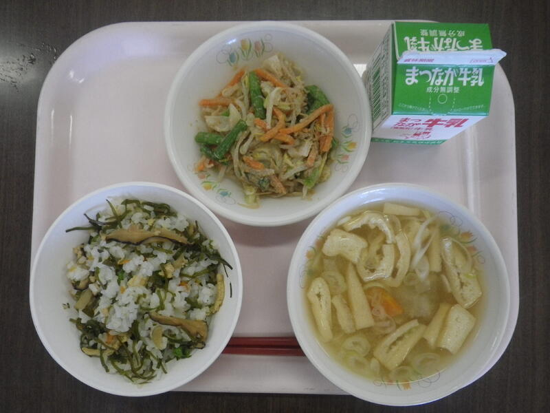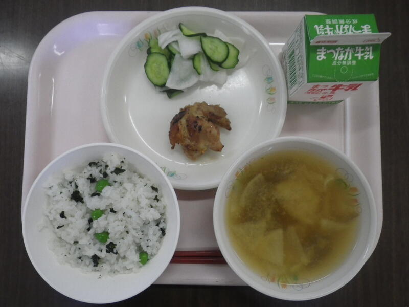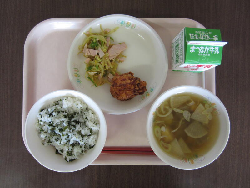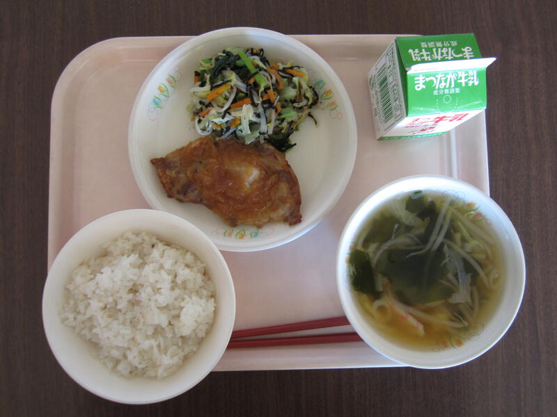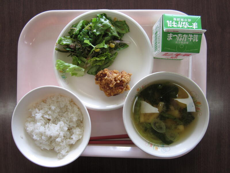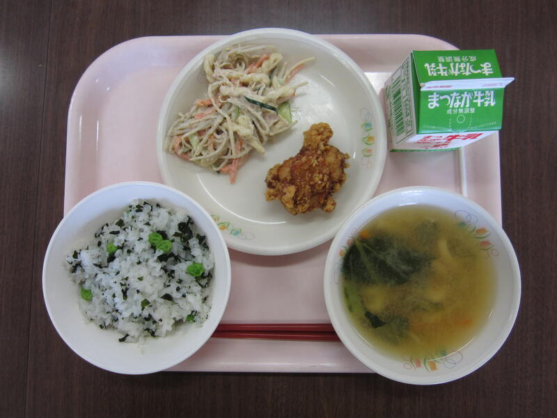 5/29 ピースわかめごはん 牛乳 とり肉のからあげ ごぼうサラダ こまつなのみそ汁