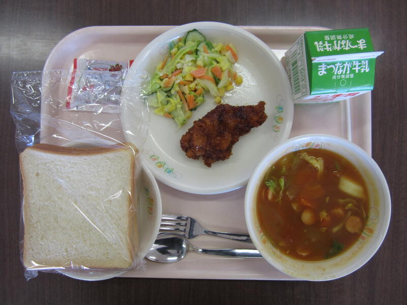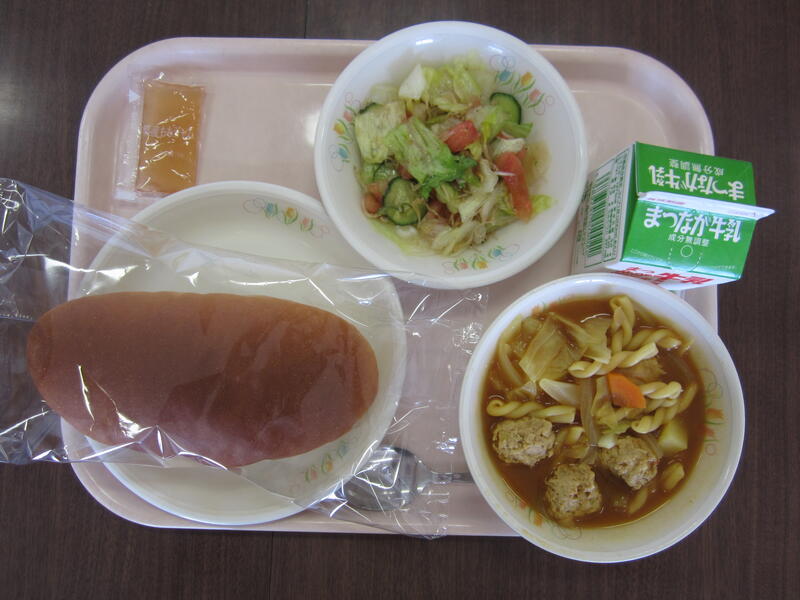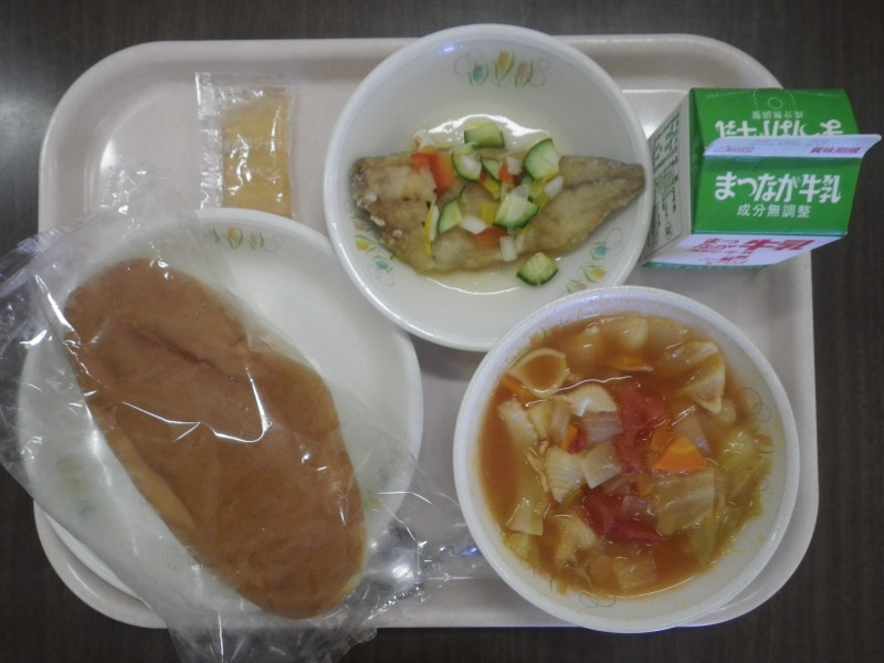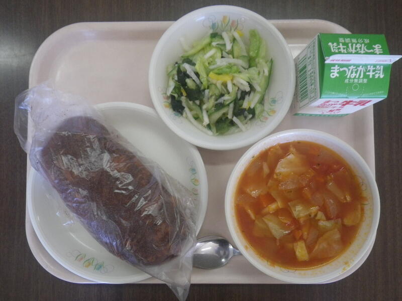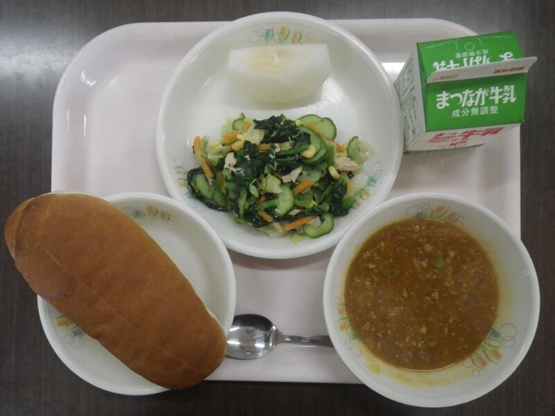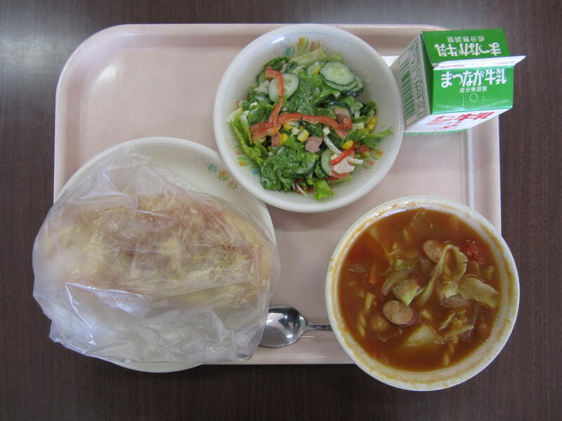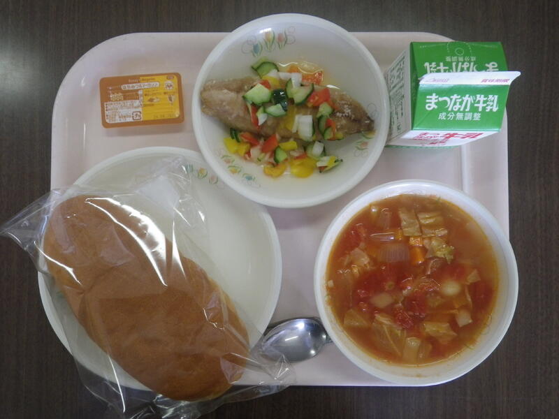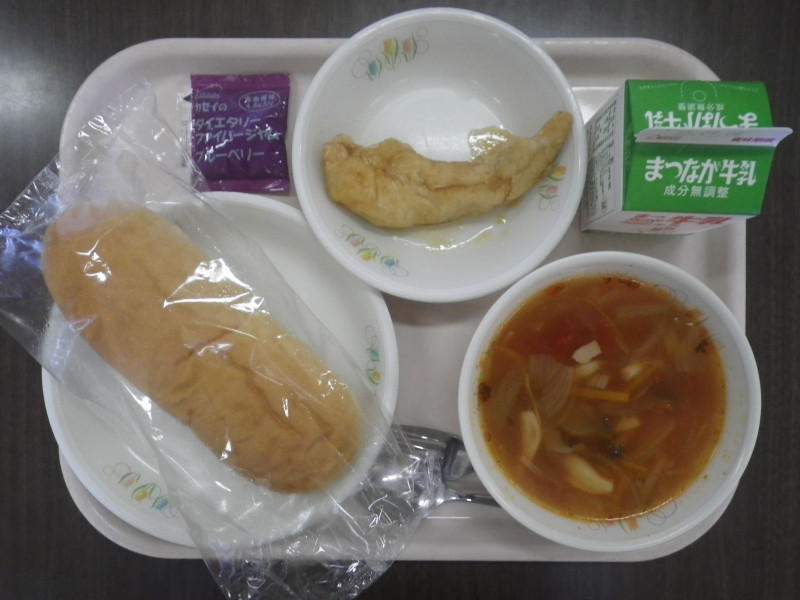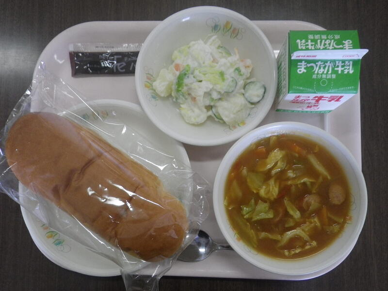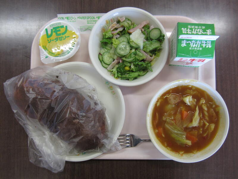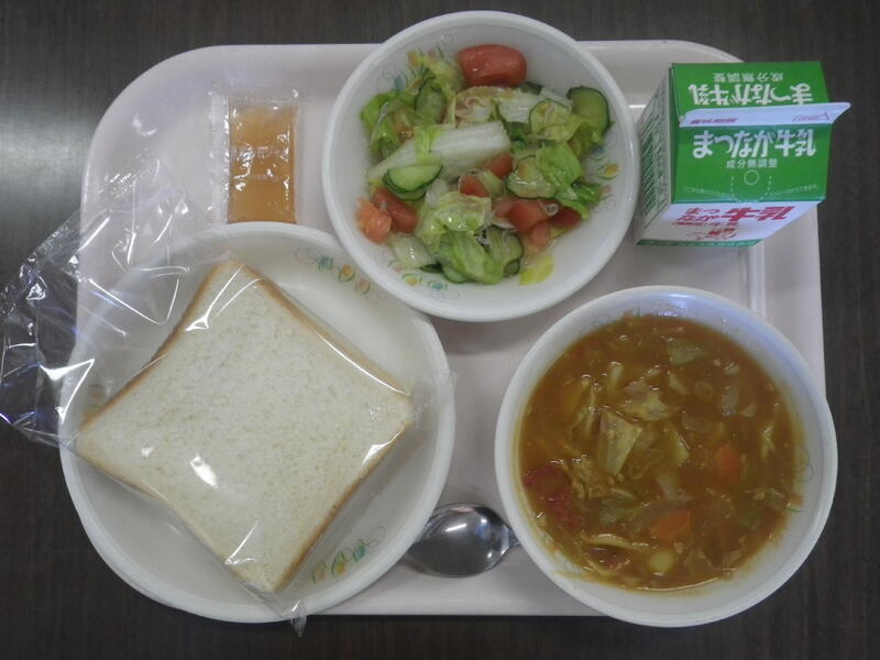 6/13 コッペパン 県産桃ジャム 牛乳 トマトとじゃこのサラダ カレースープ