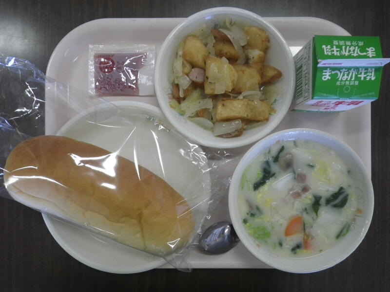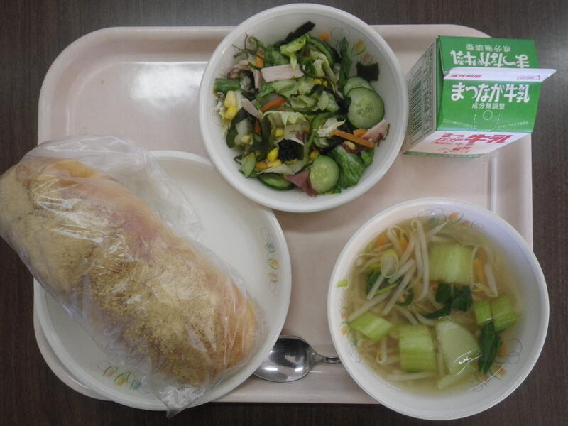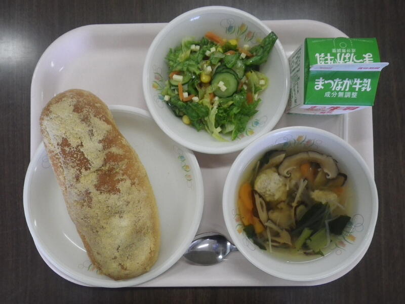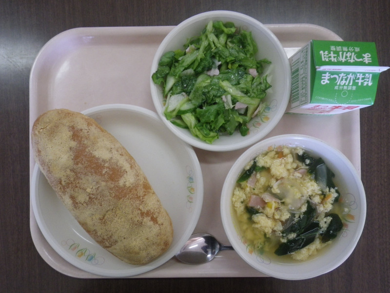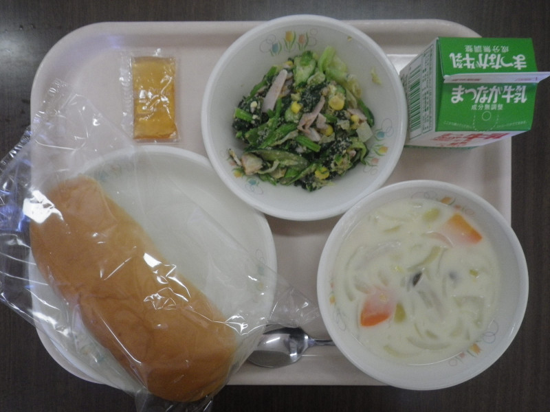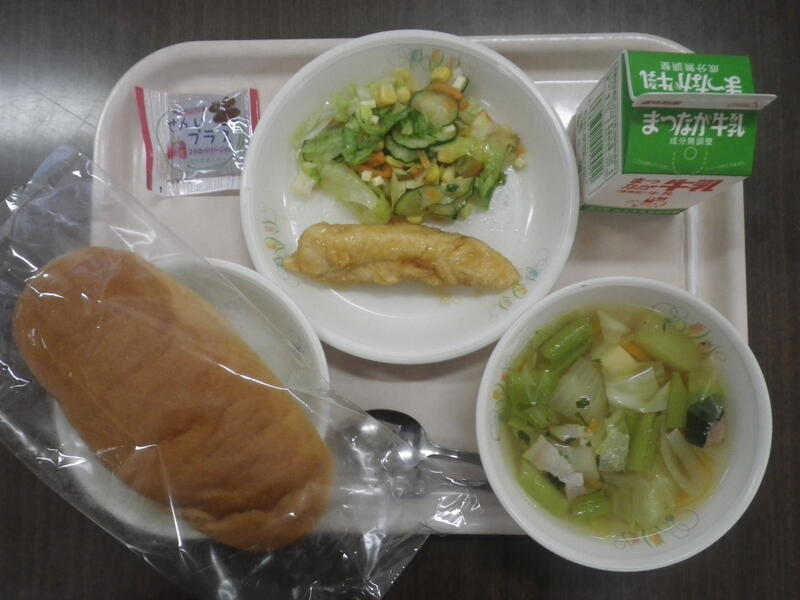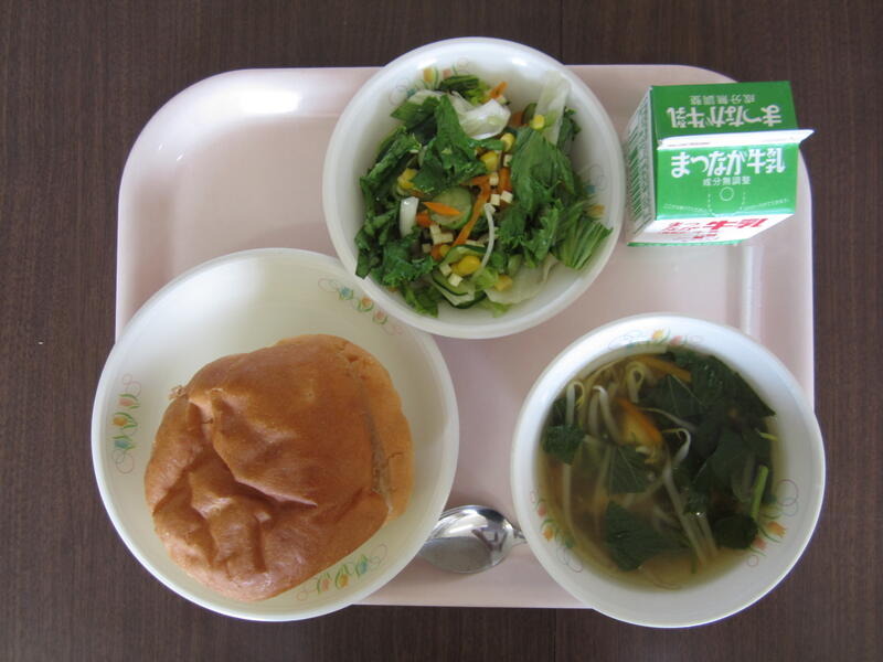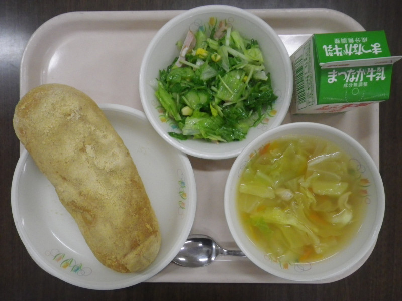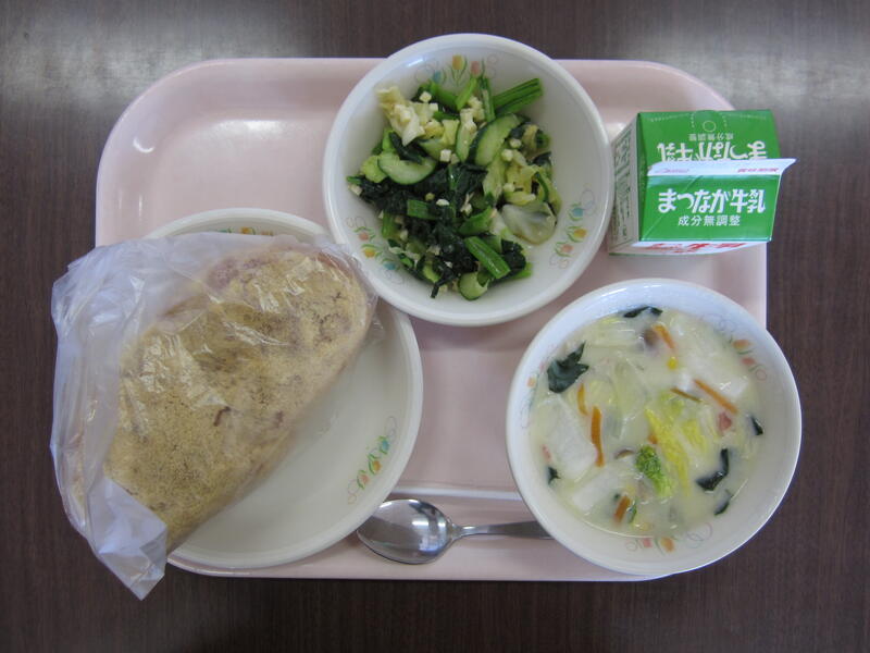 5/9 きなこあげパン 牛乳 こまつなのサラダ 豆乳スープ