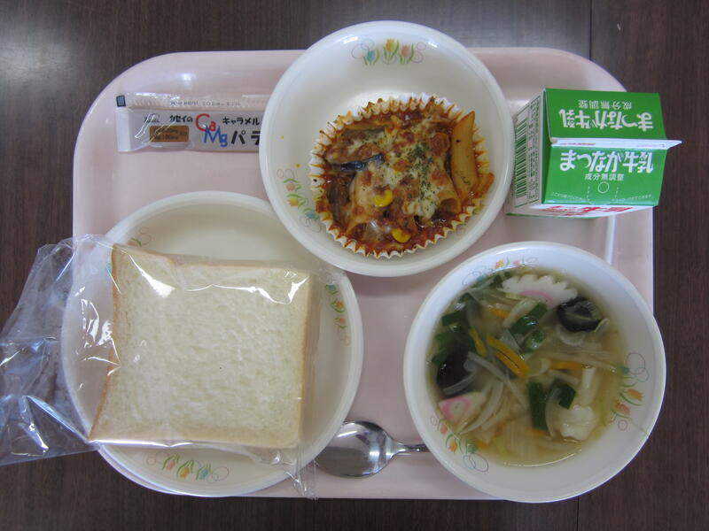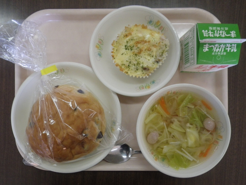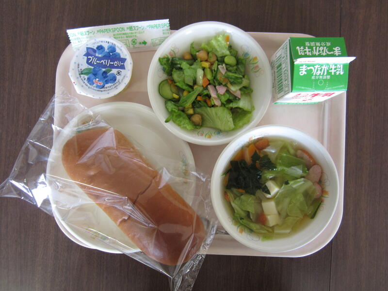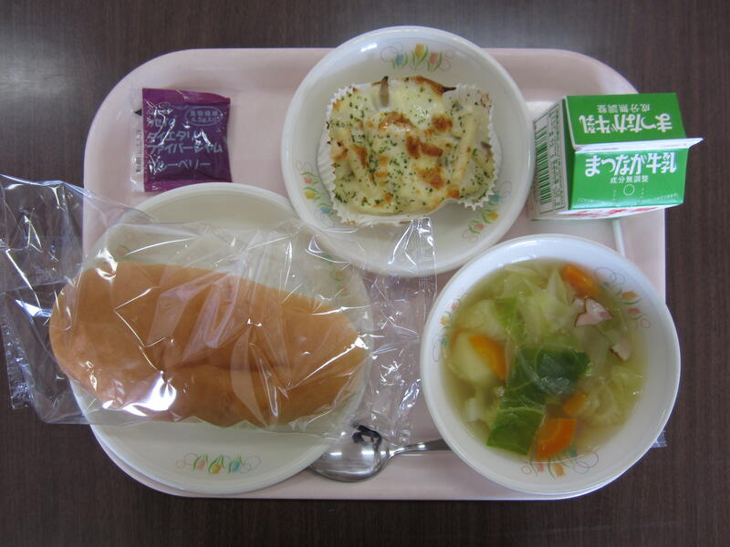 5/16 コッペパン 牛乳 ブルーベリージャム マカロニグラタン 野菜スープ