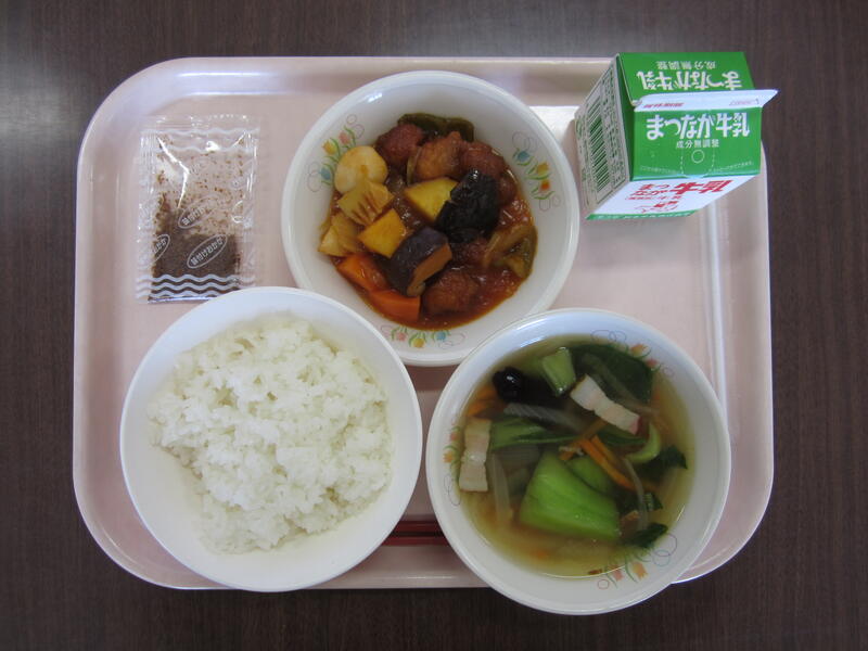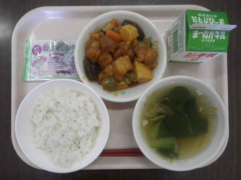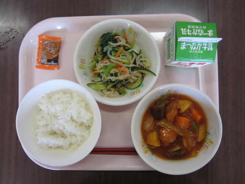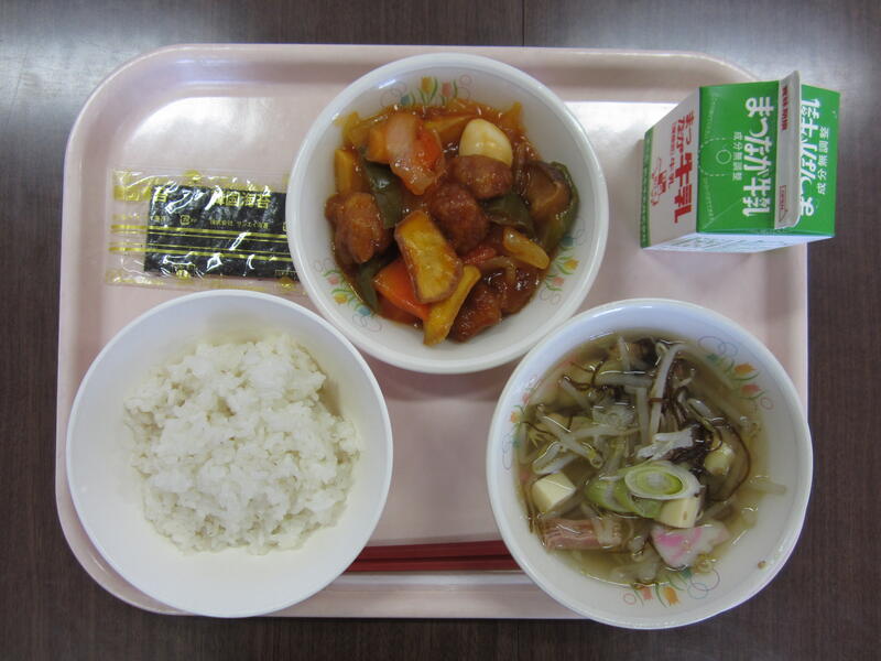 5/17 ごはん 味付けおかか 牛乳 酢豚 中華スープ
