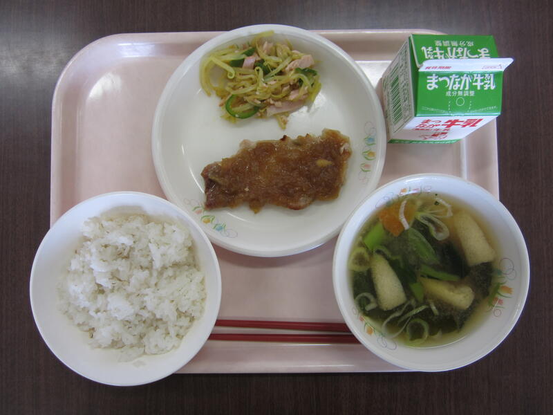 5/22 麦ごはん 牛乳 豚肉のバーベキューソースかけ もやしのカレーあえ わかめのみそ汁