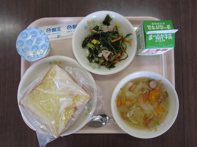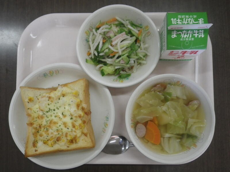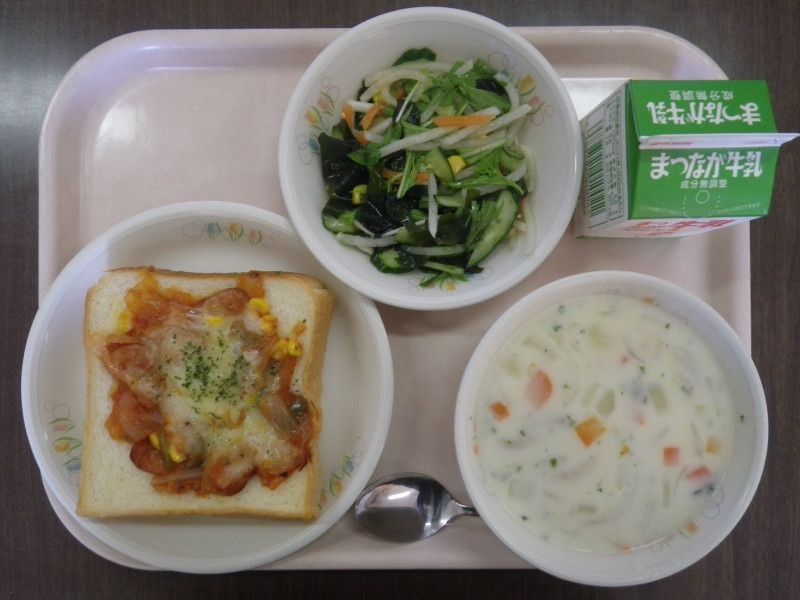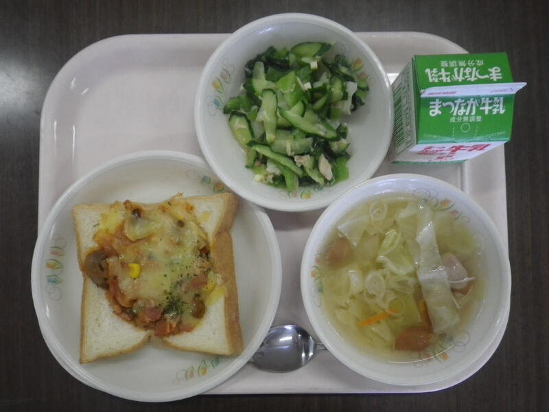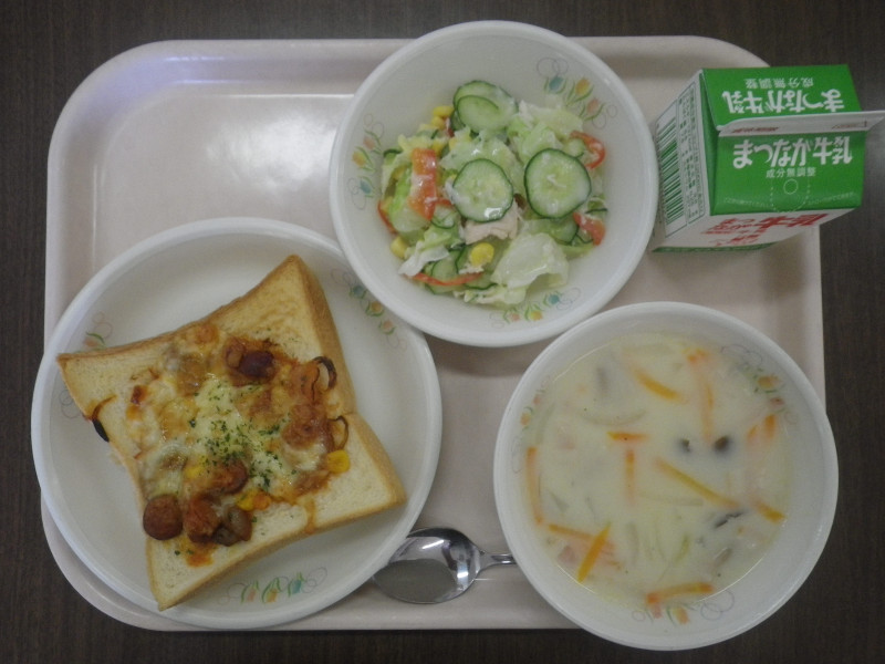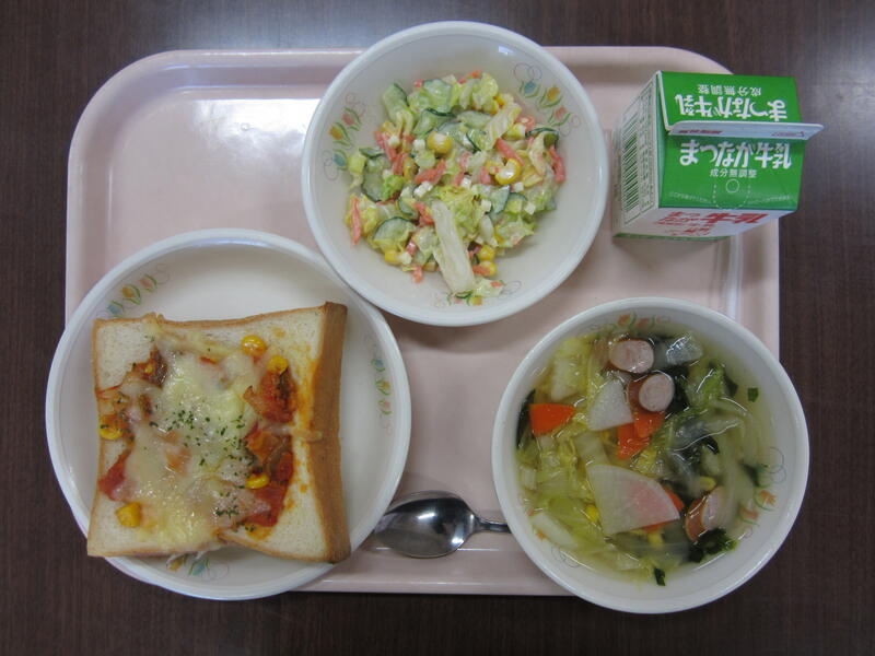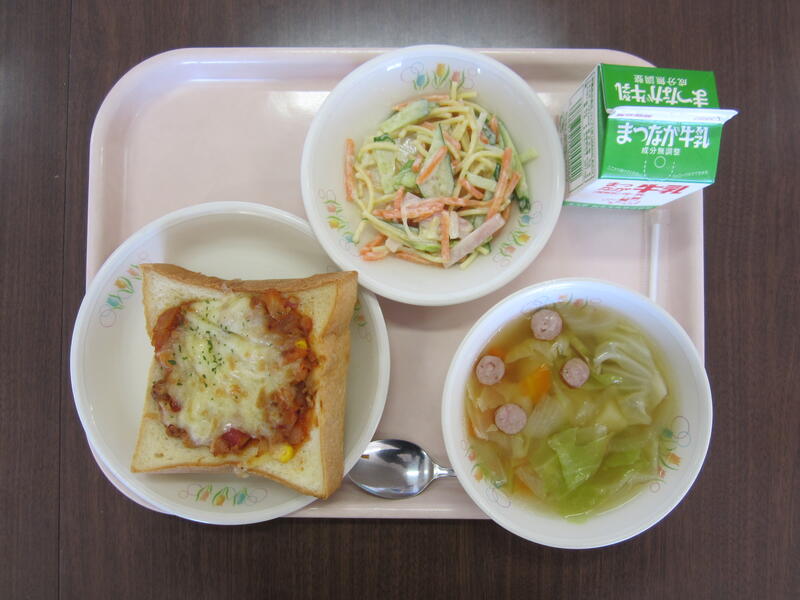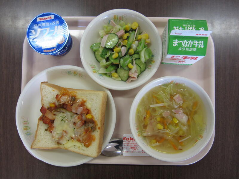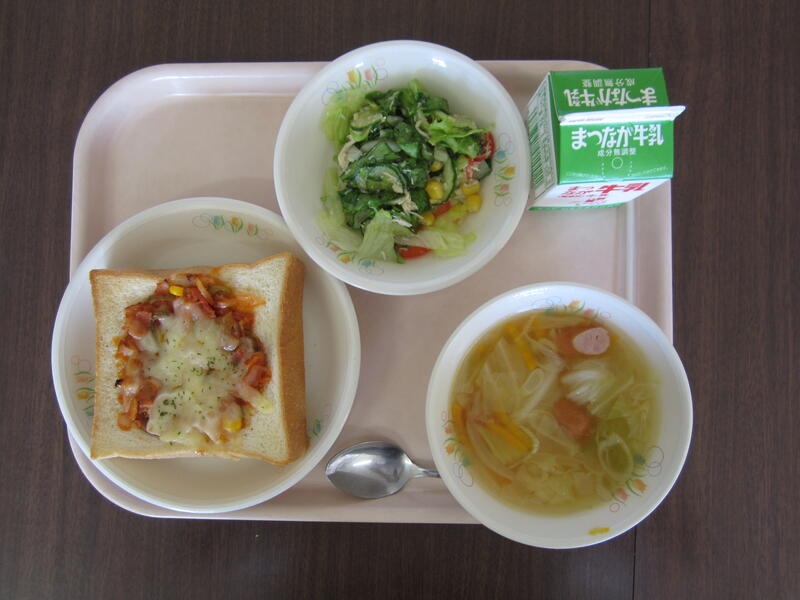 5/23 ピザトースト 牛乳 アスパラガスのサラダ オニオンスープ ヨーグルト