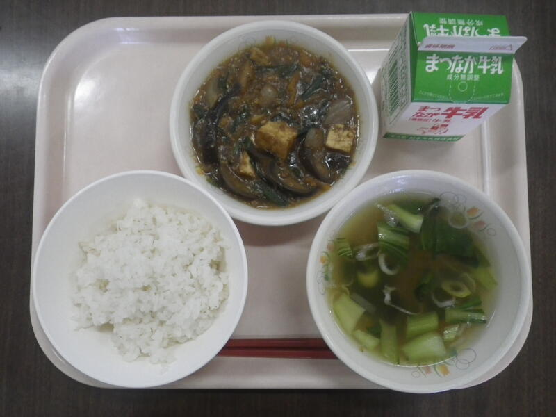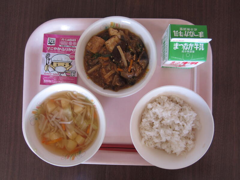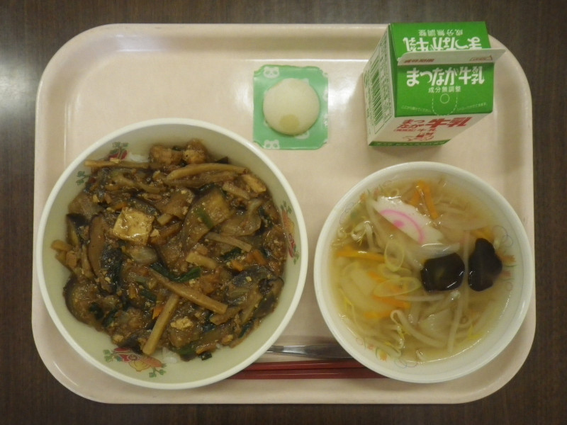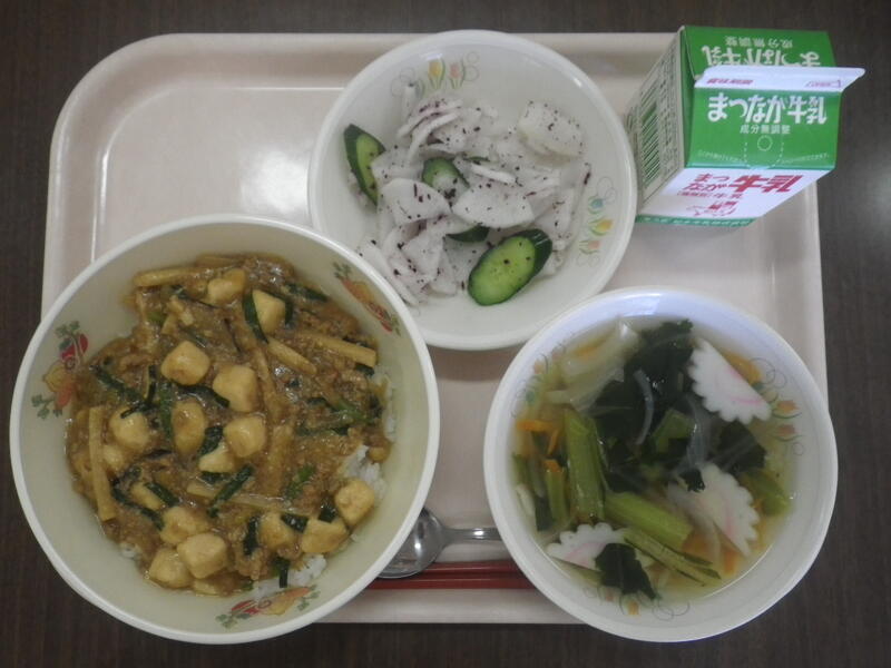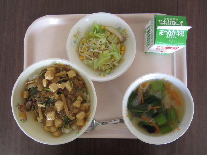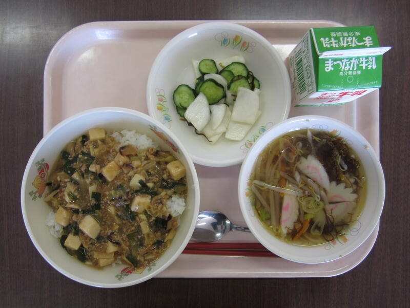 5/24 マーボー丼 牛乳 かぶときゅうりのつけもの もずくスープ