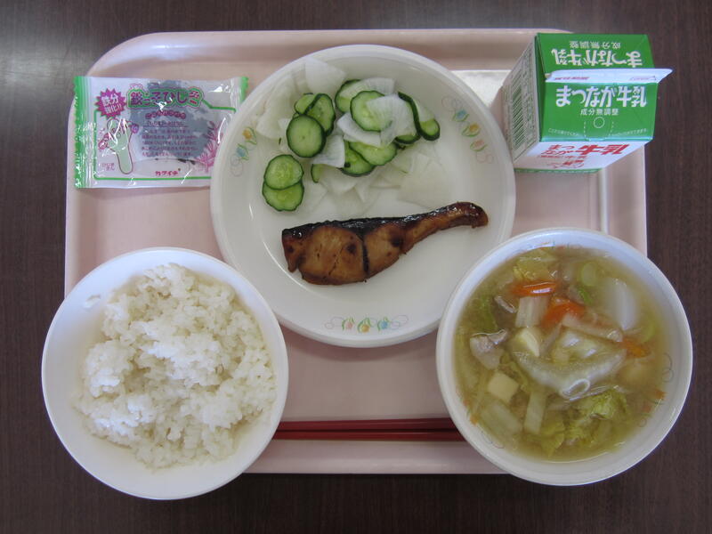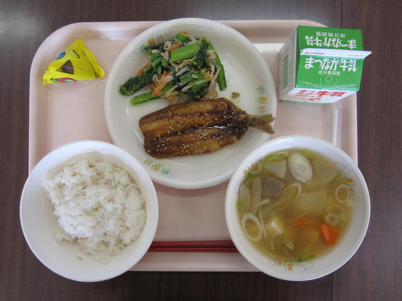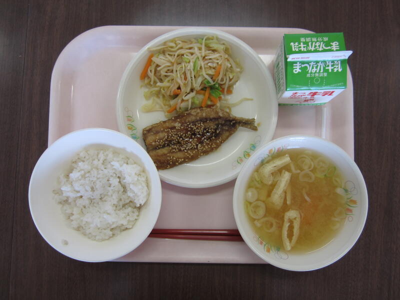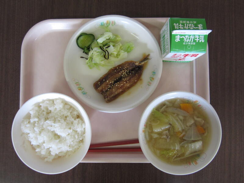 6/5 麦ごはん 牛乳 いわしのかば焼き 野菜のごま酢あえ 新玉ねぎのみそ汁