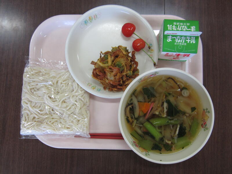 6/22 肉うどん 牛乳 いんげんのカレーあげ さくらんぼ