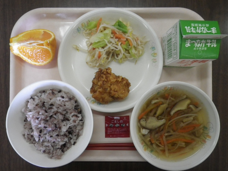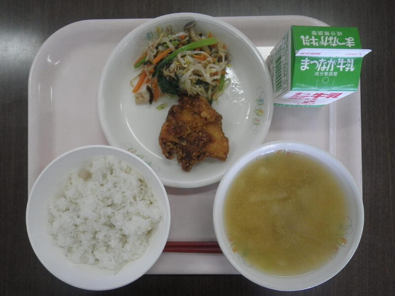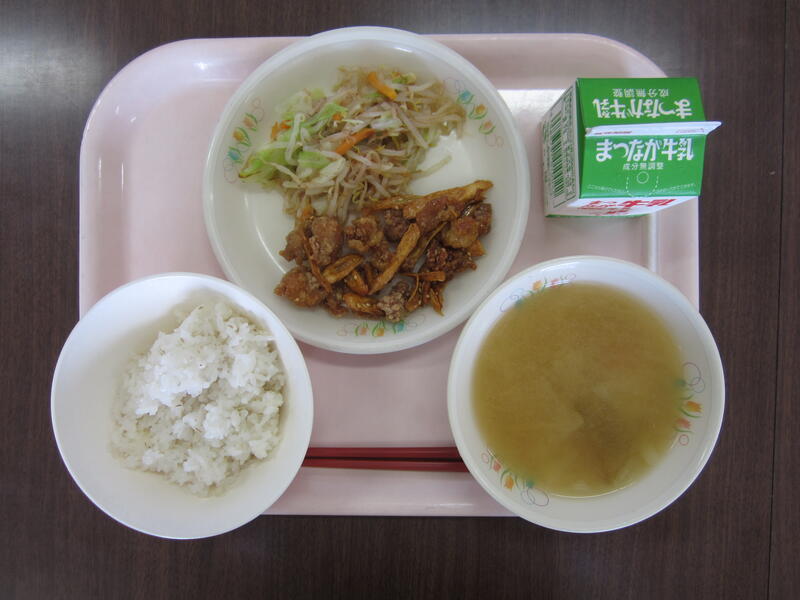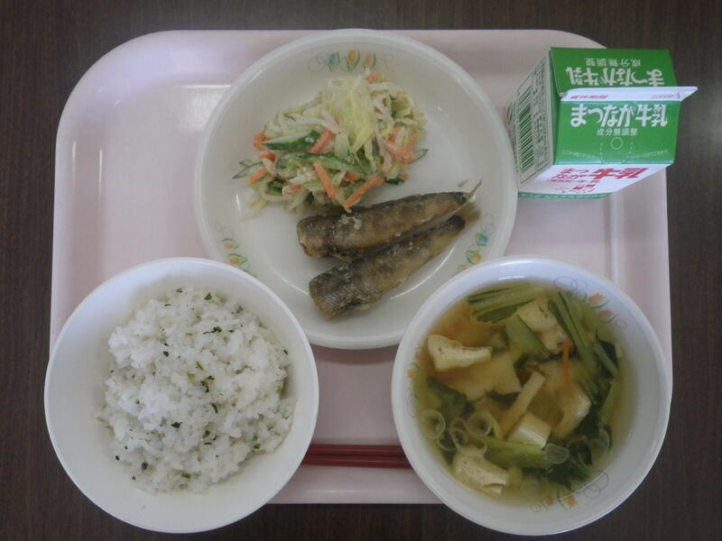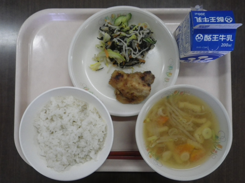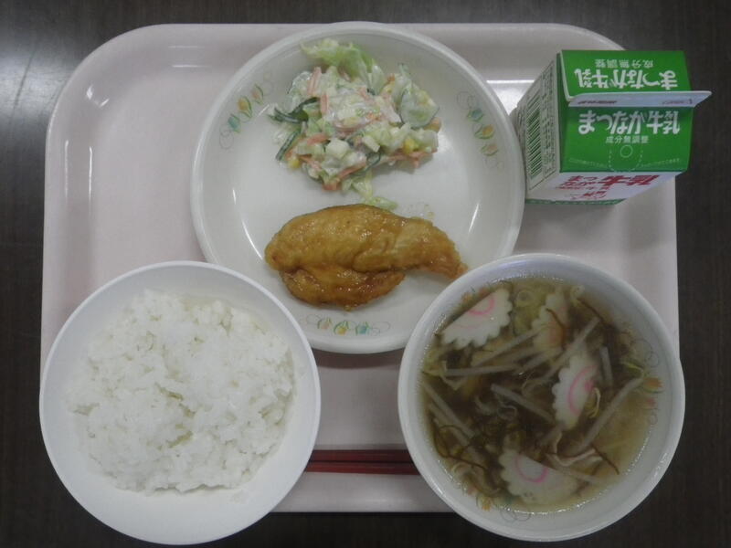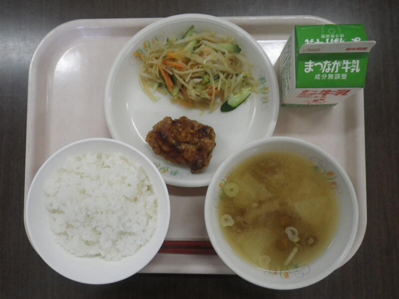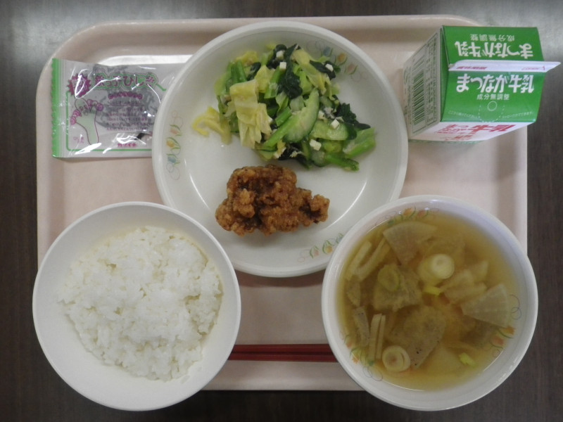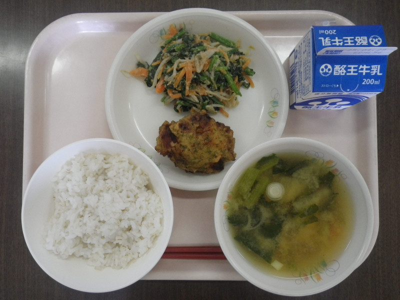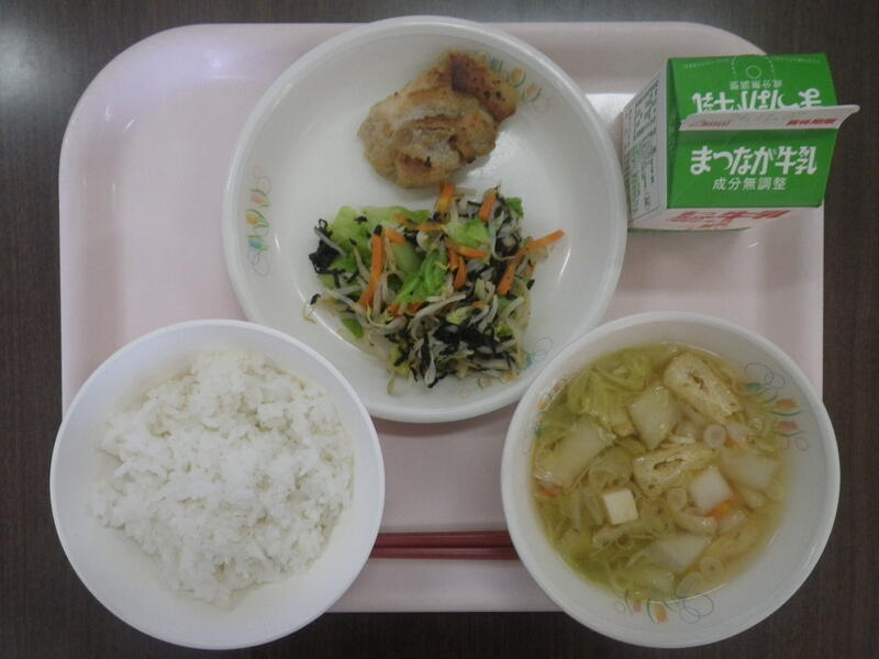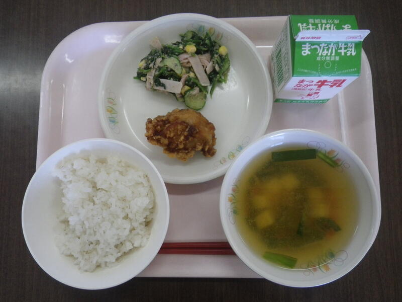 4/21 麦ごはん 牛乳 とり肉のからあげ じゃことかいそうのサラダ こまつなのみそ汁