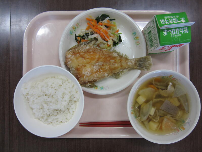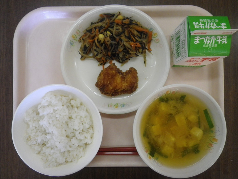 12/1 麦ごはん 牛乳 赤魚の竜田揚げ ひじきの炒め煮 にらの味噌汁