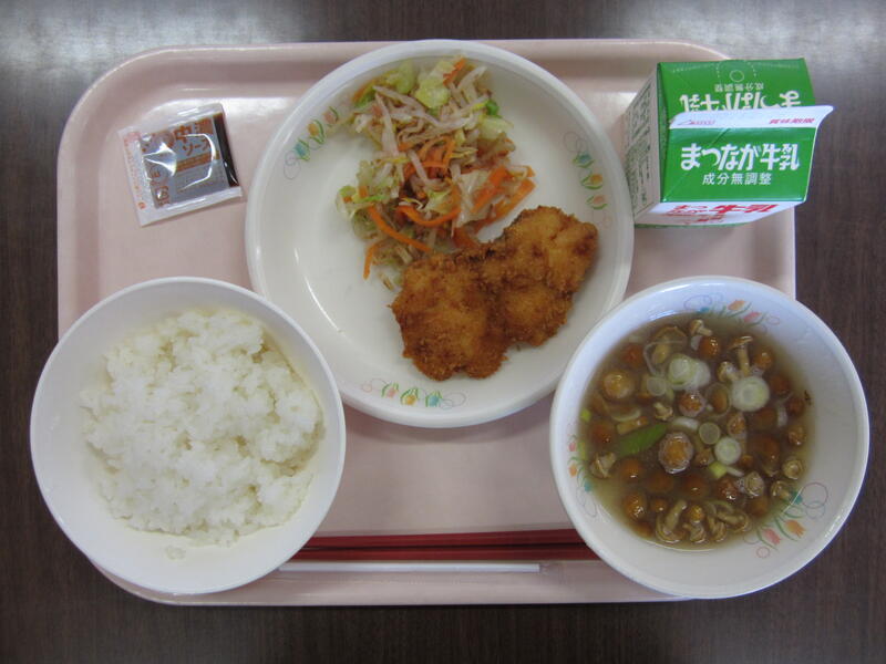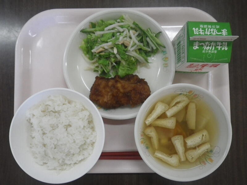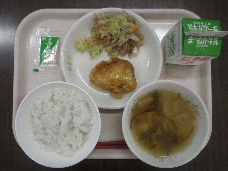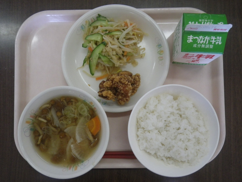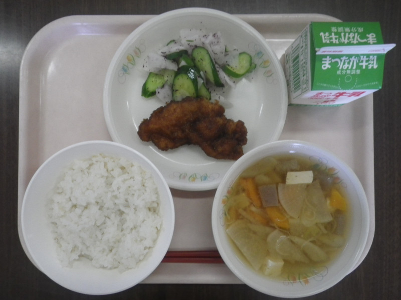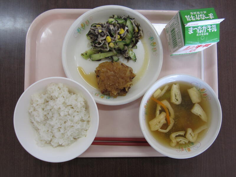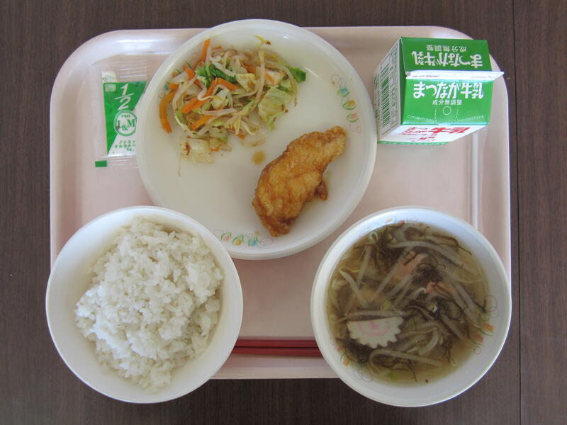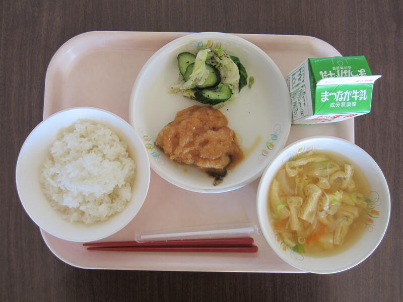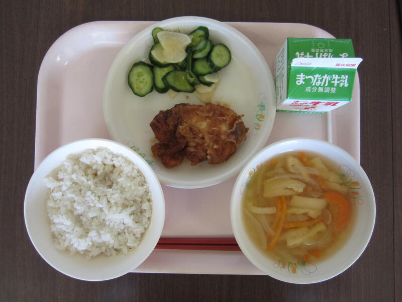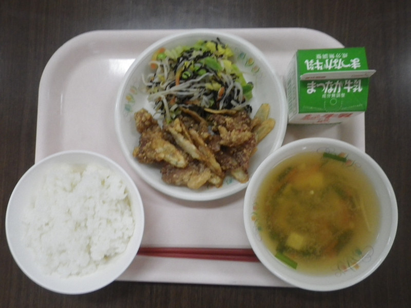 6/26 麦ごはん 牛乳 豚肉のカリンあげ おかかあえ なめこの味噌汁