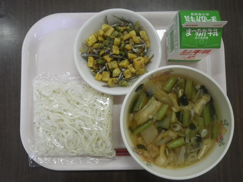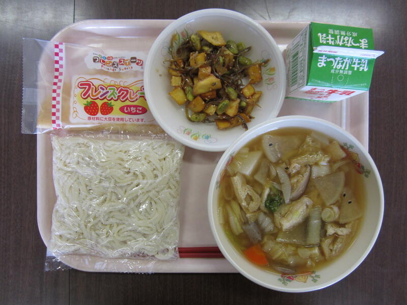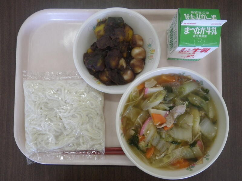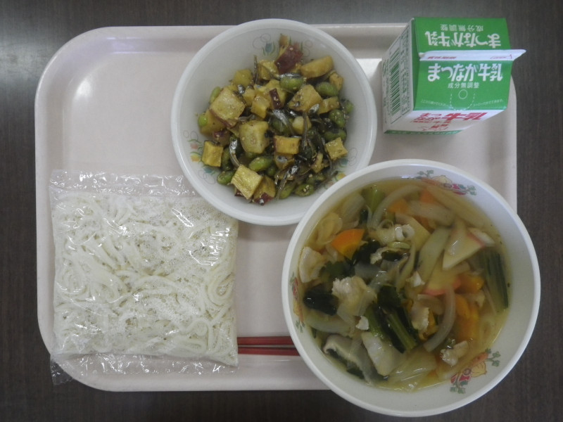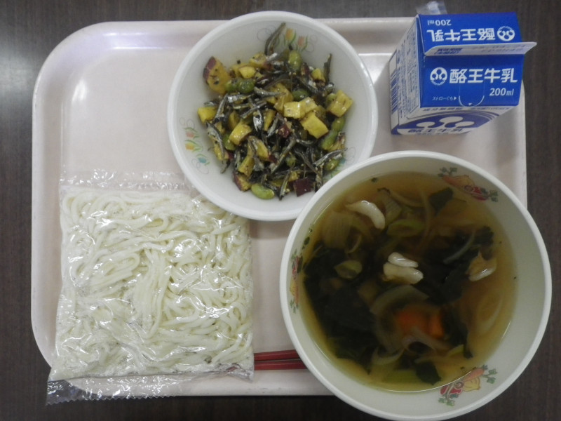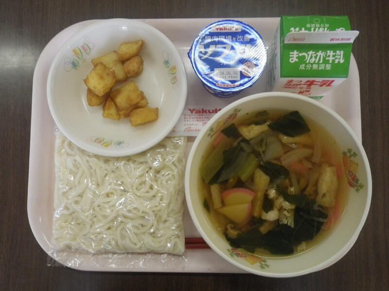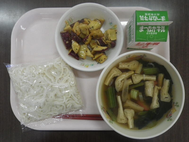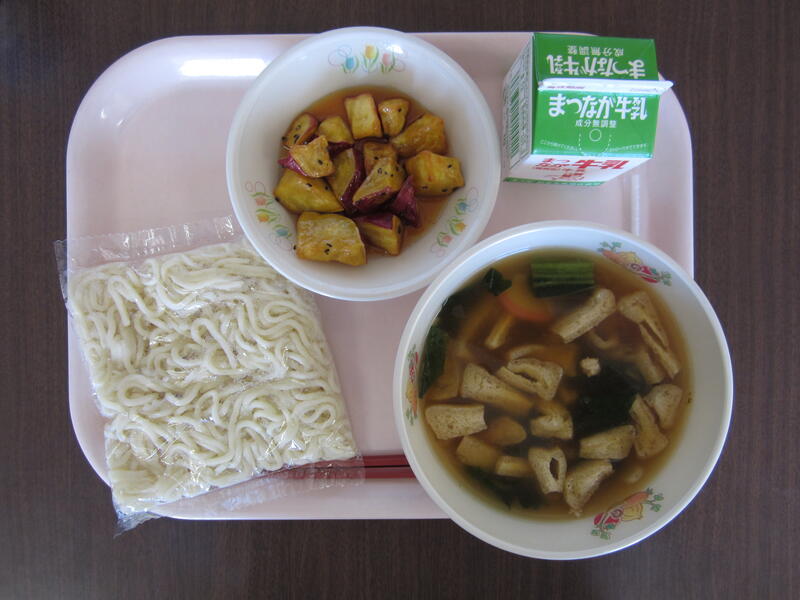 4/27 五目うどん 牛乳 さつまいもとにぼしのあげ煮 ヨーグルト