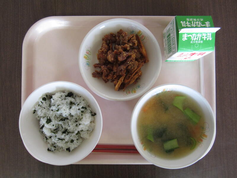 6/7 ゆかりご飯 牛乳 ツナと切干大根のあえもの じゃがいものそぼろ煮