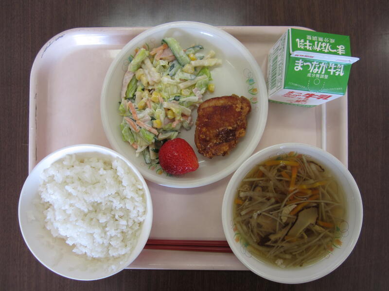 12/5 ピリ辛生揚げ丼 牛乳 小松菜スープ いちごヨーグルト