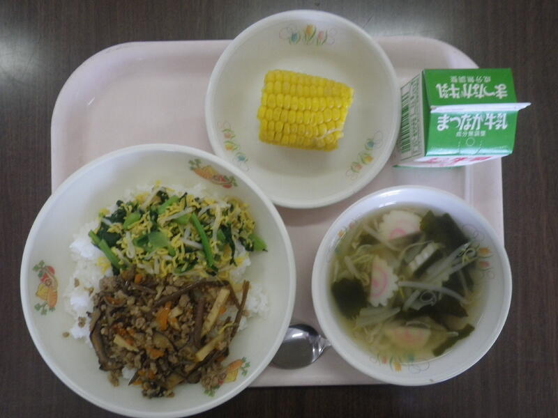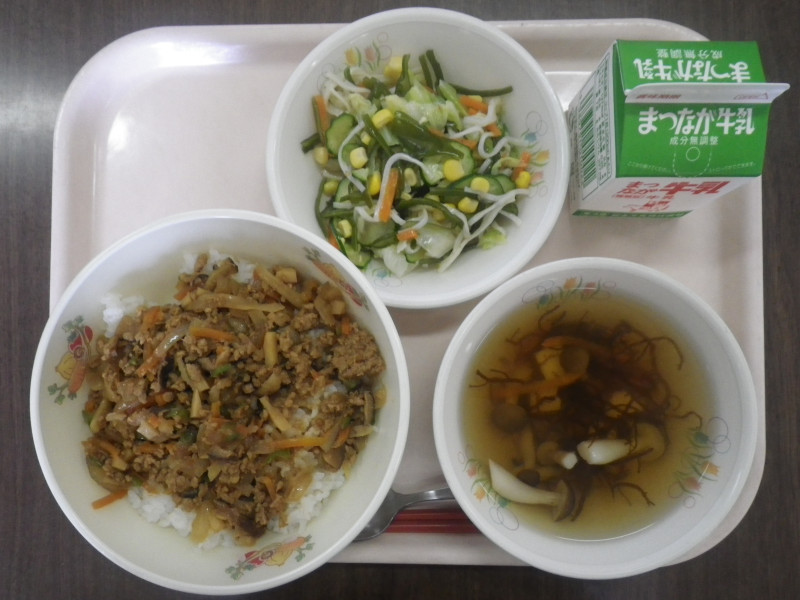 4/12 そぼろ丼 牛乳 ちぐさあえ にらと豆腐のみそ汁