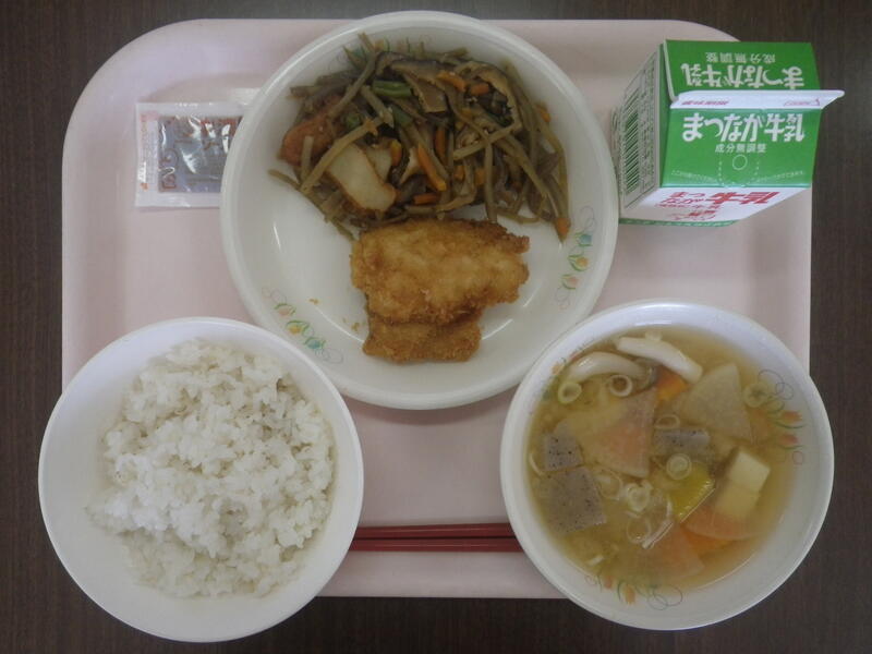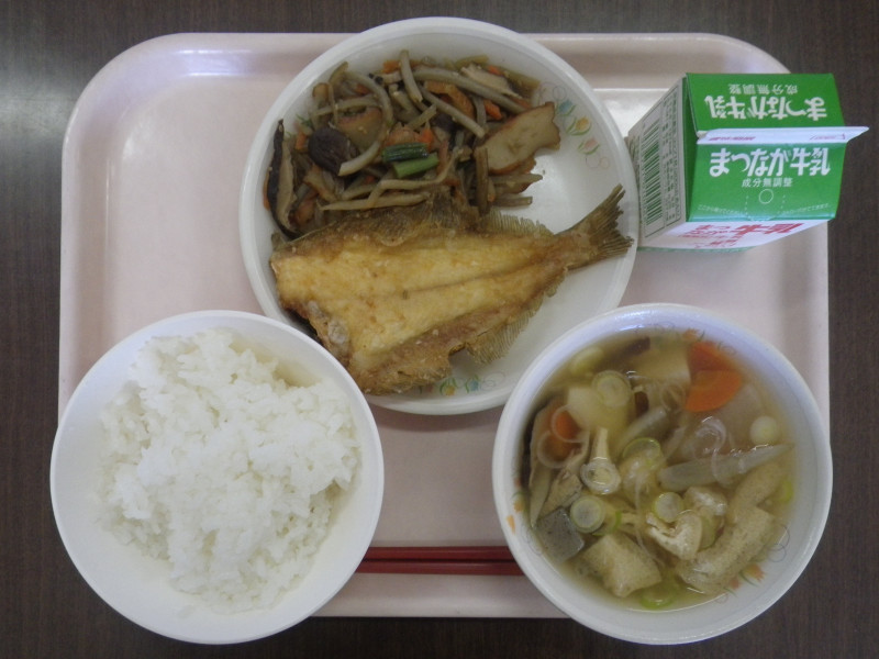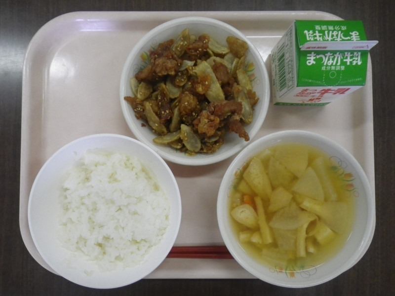 11/26 ごはん 牛乳 豚肉とごぼうのカリン揚げ 大根の味噌汁