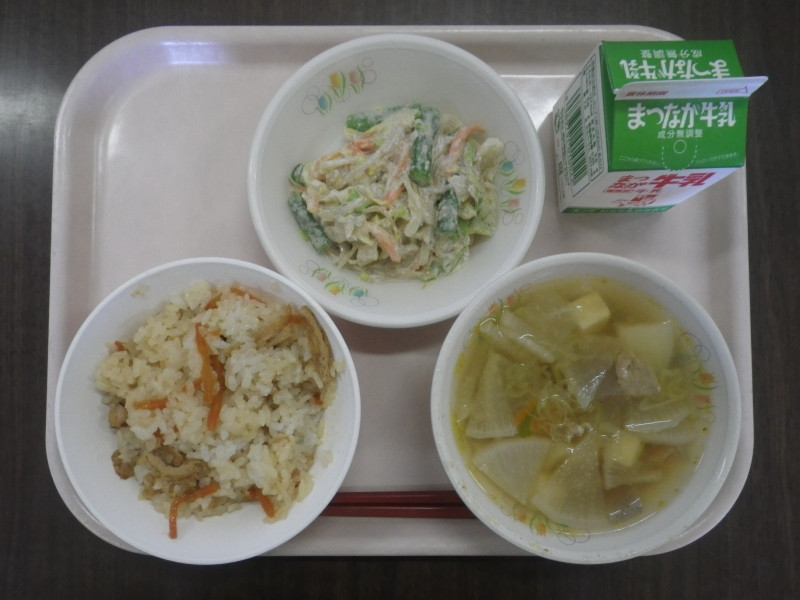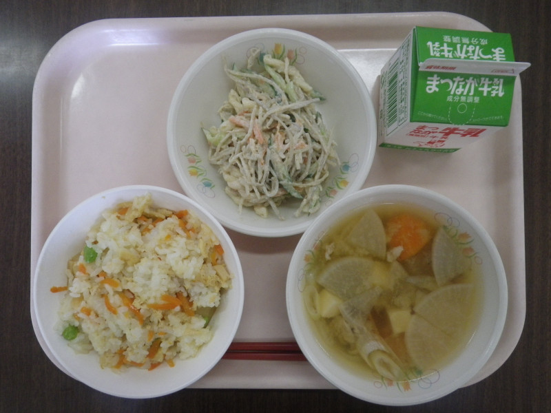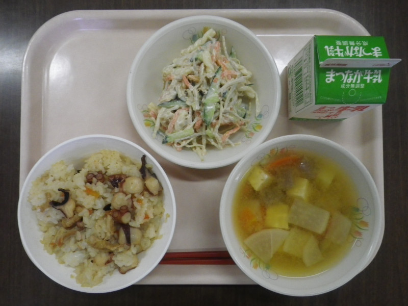 12/3 たこ飯 牛乳 ごぼうサラダ 味噌けんちん汁