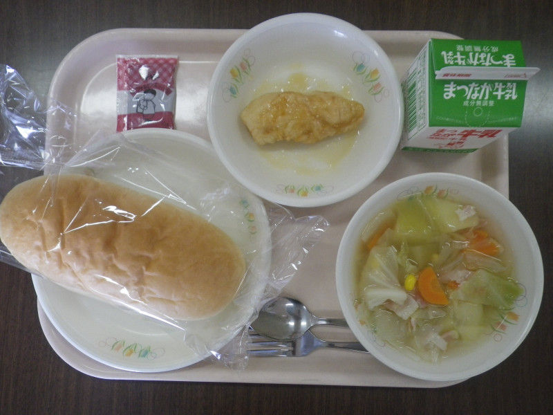 10/28 きなこ揚げパン 牛乳 ハムマリネサラダ アルファベットスープ