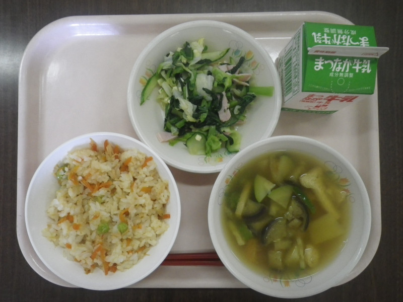 6/14 たこめし 牛乳 豚しゃぶサラダ じゃがいものみそ汁