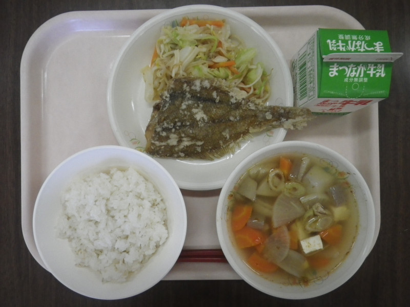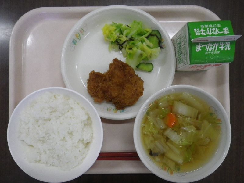 11/21 ごはん 牛乳 手作りヒレカツ キャベツの塩昆布和え てっちり(ふぐ鍋)