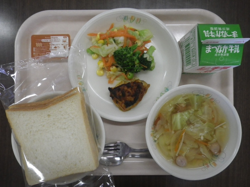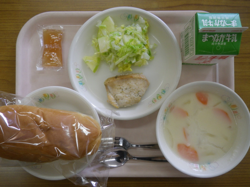 11/18 コッペパン 県産桃ジャム 牛乳 白菜とりんごのサラダ 県産鶏肉のハーブ焼き クリームスープ