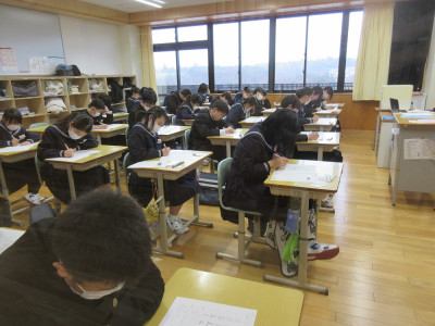 今日と明日は期末テストです。今日は4教科のテストがあり、真剣に問題に取り組んでいました。明日は、5教科となりますので、今頃家で最後の追い込み中かと思います。3年生は学級閉鎖があり、テストは延期となりました。その分たくさん準備ができると思います。テスト範囲の教科書をよく読み、ノートやワークブックをよく見直して、みんなの学習の成果に期待しています。がんばれ!二中生!