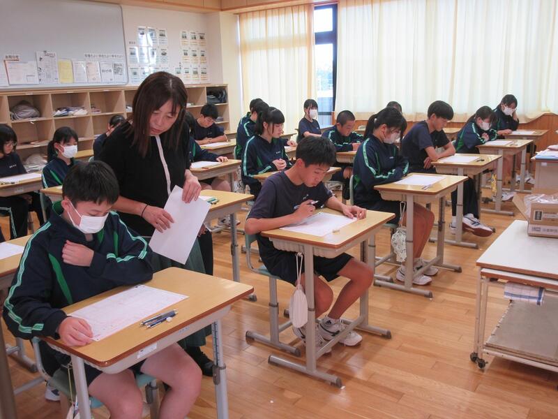 授業では、比例の問題を真剣に解く生徒の姿が見られました。