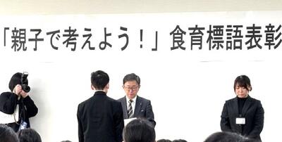 過日,本ホームページでもお知らせした令和5年度第4回「親子で考えよう!食育標語」表彰式が1月30日(火)相馬市役所で写真のとおり開催されました。本校からは,最優秀賞に輝いた2年生生徒とその保護者様が表彰式に出席しました。おめでとうございます。
