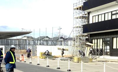 令和4年3月に発生した地震による被害を受けた校舎の屋根工事が間もなく終了します。工事のための足場解体が写真のとおり,2月2日から本格的に始まっています。