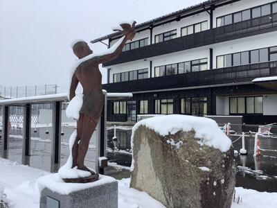 2月6日は今シーズン初の積雪となりました。玄関のベンチには誰かがつくった雪だるま一つたたずんでいました。