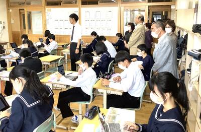 来校された皆様には,授業の様子や校舎を見学していただいた(写真のとおり)のち,校長,教頭と懇談をしました。懇談の中で,訪問いただいた皆様は,落ち着いて学んでいる本校生徒や授業で生徒が活用していたタブレット端末・ICT機器の活用に特に感心されておりました。また,本校の課題の一つである不登校対策の取り組みやSNS等の今日的な課題についても話題が及びました。