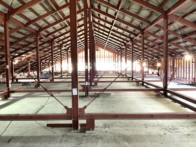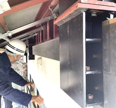 現場での説明では,北東方向にずれた屋根全体を元の位置に戻す作業や校舎本体に新たなボルトで固定する作業は終了し,現在は側面から鉄骨でできた金具を取り付け,屋根を安定させる作業を行っており,その次には側面等の壁を設置する作業に移行しているとのことでした。(以下の写真参照)