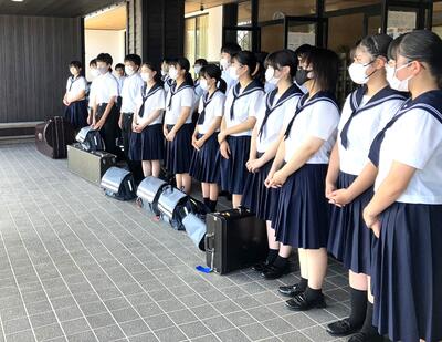 審査の結果,本校吹奏楽部は,優秀賞を受賞することができました。これまでの生徒達の努力を大いにたたえるとともに,生徒達を励まし続け,送迎等様々なご配慮をしていただくなど,ご尽力いただきました関係保護者様,関係者様に厚く感謝申し上げます。ありがとうございます。(写真は帰校式の様子)