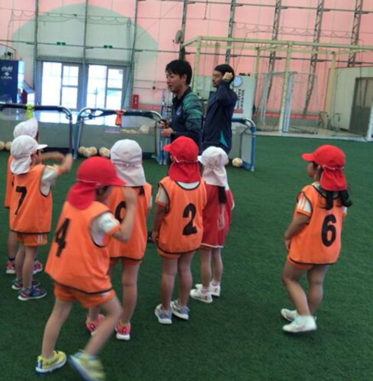 楽天相馬こどもドームで、市内幼稚園のスポーツ交流会が行われました。今回は、飯豊幼稚園のみなさんと一緒にキッズプログラムに参加し、おわりに、年長・年少チームそれぞれ2つに分かれて、サッカーの試合をしました。最後まで精一杯体を動かすことができました。