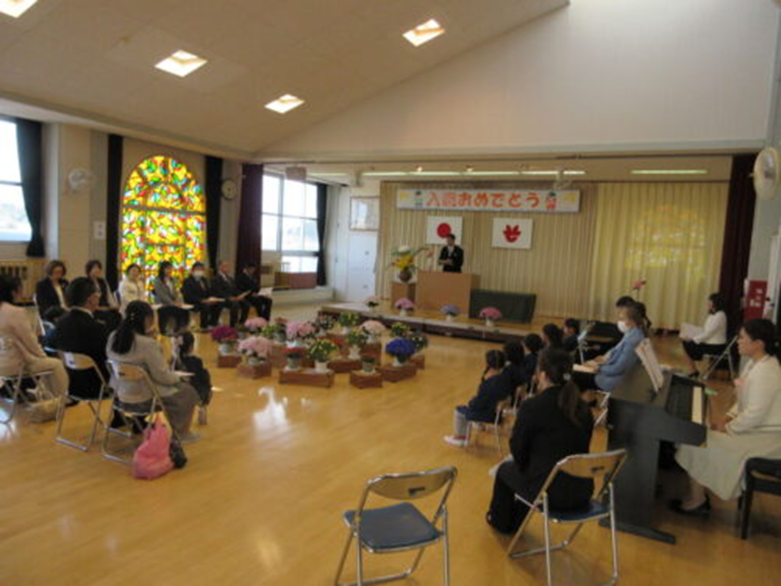 2025年4月8日 16時00分 幼稚園の入園式を行いました。PTA会長様、佐藤満市議会議員様を始め、多数のご来賓の皆様が見守る中、新しく2名の仲間を迎え入れました。担任の先生の呼名に対し元気に返事ができました。年長組のみんなから、歌や踊りで歓迎を受け、とても温かい雰囲気の入園式になりました。これからの活動も楽しみですね。入園おめでとうございます。